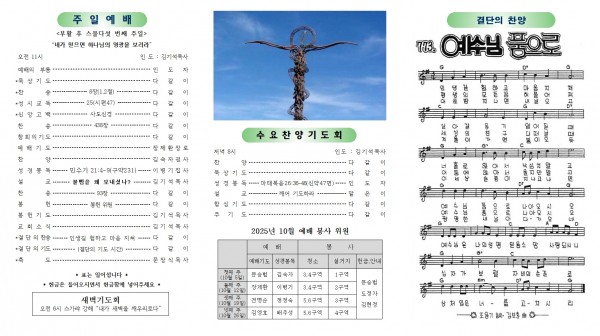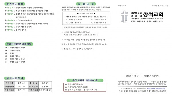 상석교회 2025년 10월 12일 교회소식 및 주보
