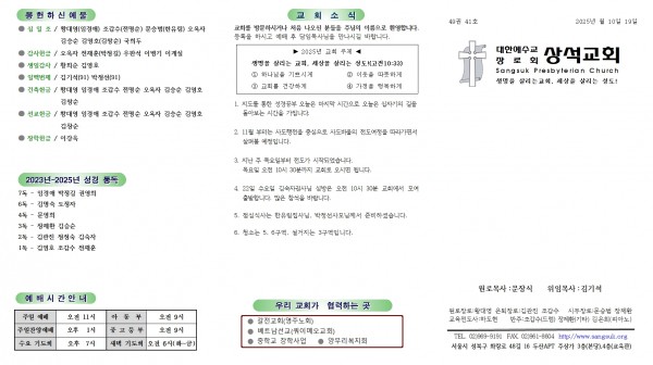 상석교회 2025년 10월 19일 교회 소식 및 주보