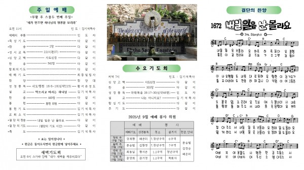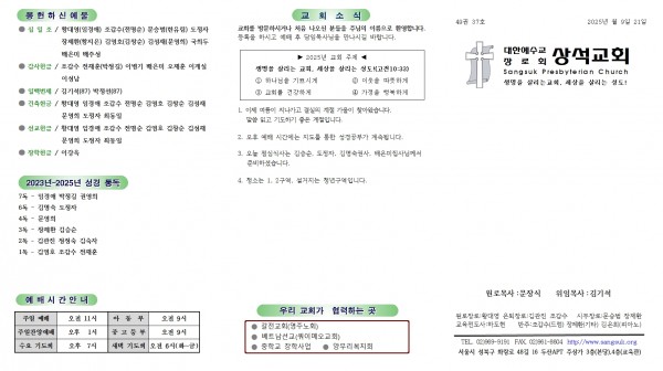 상석교회 2025년 9월 21일 교회 소식 및 주보