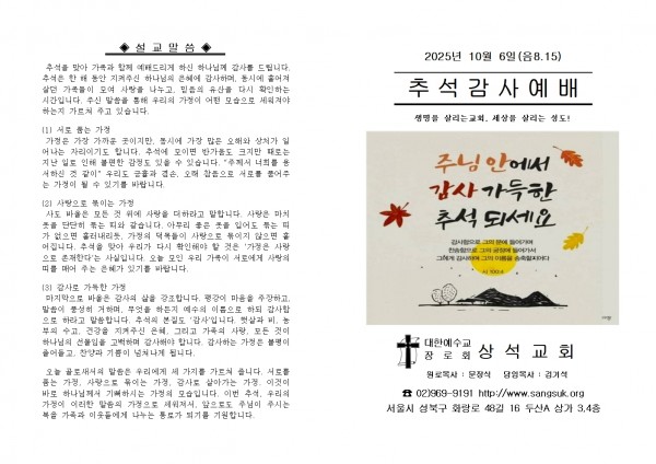 오늘 골로새서의 말씀은 우리에게 세 가지를 가르쳐 줍니다. 서로를 품는 가정, 사랑으로 묶이는 가정, 감사로 살아가는 가정. 이것이 바로 하나님께서 기뻐하시는 가정의 모습입니다. 이번 추석, 우리의 가정이 이러한 말씀의 가정으로 세워져서, 앞으로도 주님이 주시는 복을 가족과 이웃들에게 나누는 통로가 되기를 기원합니다.
