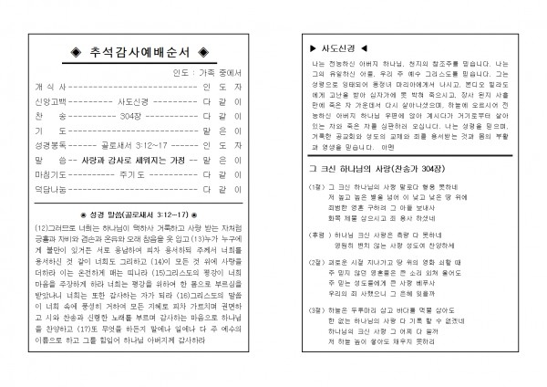 사도 바울은 모든 것 위에 사랑을 더하라고 말합니다. 사랑은 마치 옷을 단단히 묶는 띠와 같습니다. 아무리 좋은 옷을 입어도 묶는 띠가 없으면 흘러내리듯, 가정의 덕목들이 사랑으로 묶이지 않으면 흩어집니다. 추석을 맞아 우리가 다시 확인해야 할 것은 ‘가정은 사랑으로 존재한다’는 사실입니다. 오늘 모인 우리 가족이 서로에게 사랑의 띠를 매어 주는 은혜가 있기를 바랍니다.
