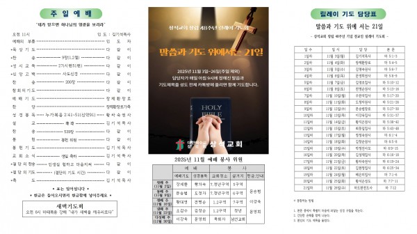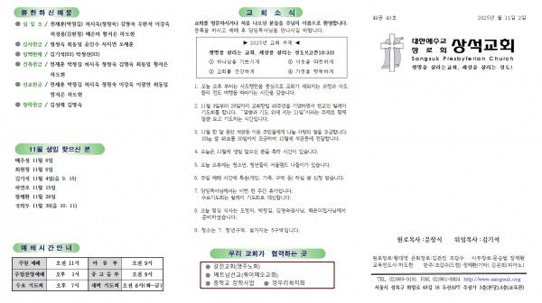 상석교회 2025년 11월 2일 교회 소식 및 주보