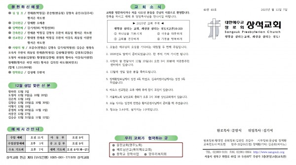 상석교회 2025년 12월 7일 교회소식 및 주보